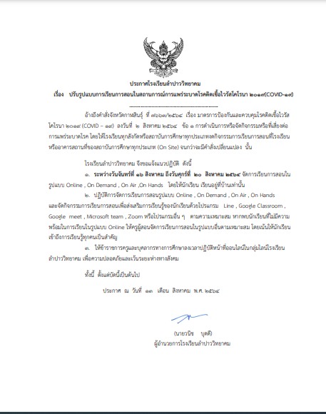 ประกาศงดการจัดการเรียนการสอนรูปแบบ onsite 16-20 ส.ค. 2564